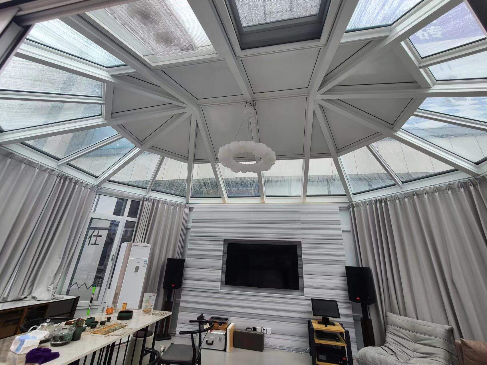 The Diamond Roof Sunroom is designed to prioritize natural light and viewing experiences: large-area glass panels cover the walls and often parts of the roof, creating a 360° fully transparent space that seamlessly connects the interior with the outdoors. The glass panels are made of high-quality tempered glass (with optional double-glazed insulated glass), maintaining high transparency while offering excellent UV protection and impact resistance—effectively preventing furniture fading and protecting occupants’ skin . The peak height of the diamond roof reaches up to 3.6 meters, greatly enhancing spatial openness and allowing light to penetrate every corner, eliminating dark areas. For users needing to adjust light intensity, customizable retractable curtains or built-in blinds are available, enabling flexible adjustments based on time of day or privacy needs without compromising panoramic views .